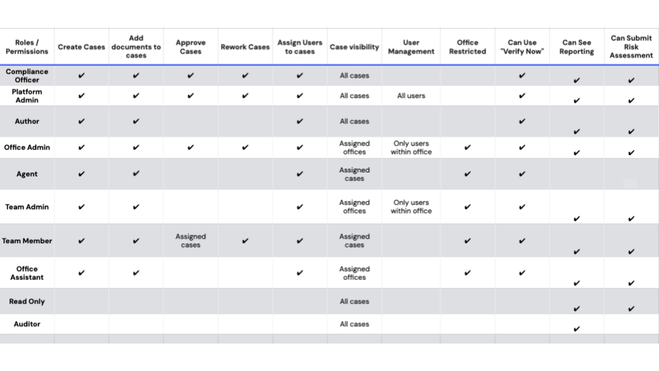 The First AML Platform offers different user roles to provide flexibility and control over access and permissions. User roles determine the level of functionality and access each user has within the platform.