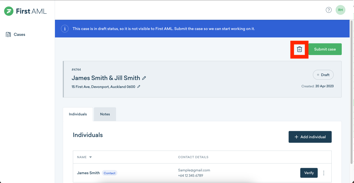Once you have entered the case details, you will land on a Draft case. - You can add individuals, edit their contact details, verify them, and add notes before submitting your case.