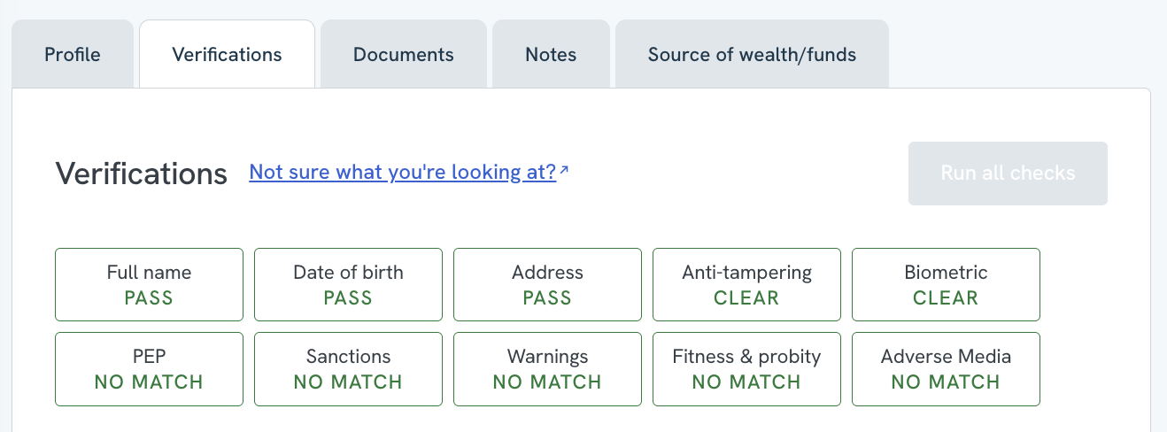 First AML's Verification report consists of a results summary at the top of the tab, followed by a detailed breakdown of each check underneath. For a full example, scroll to the bottom of this article.