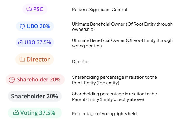 New visual tags help you understand roles, risks and ownership at a glance. These labels improve structure readability and make it easier to identify who holds control or significant ownership.